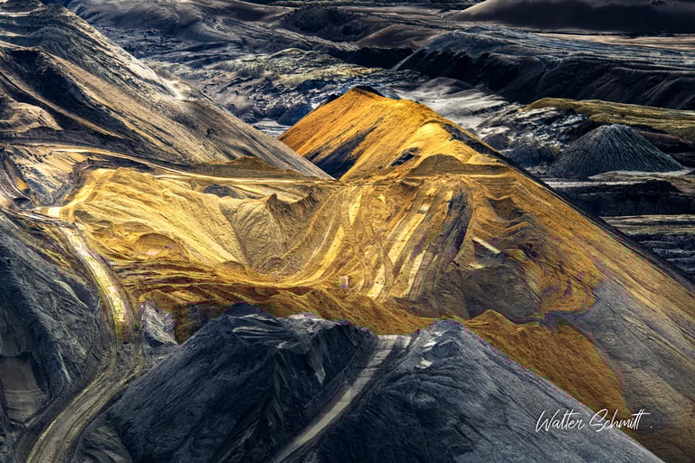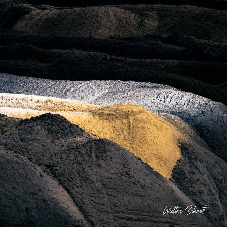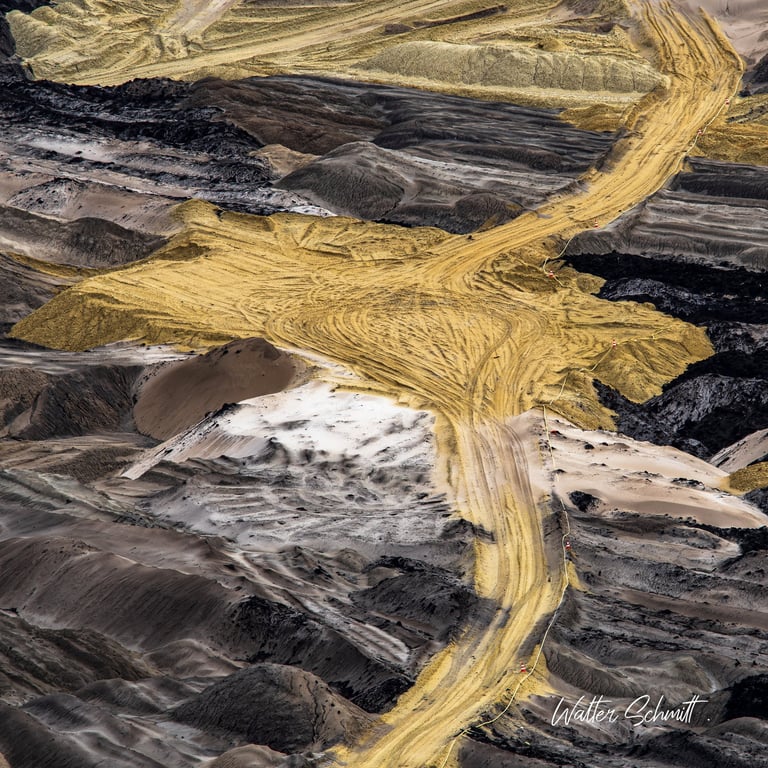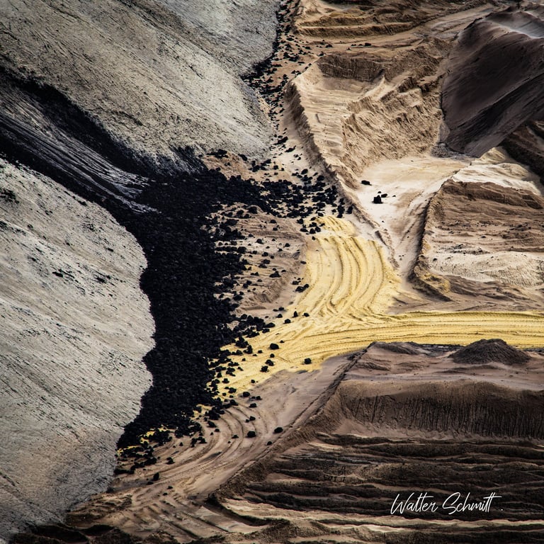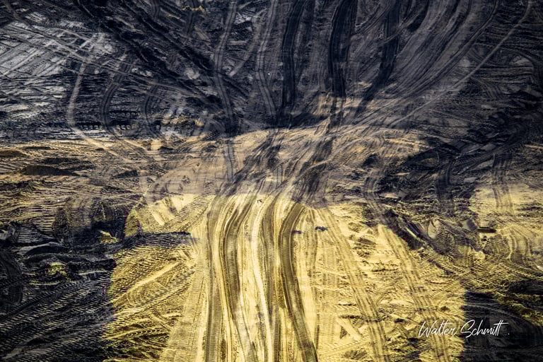 Im rheinischen Braunkohlerevier geht die Ära des Kohleabbaus und die damit verbundene Umweltzerstörung ihrem Ende entgegen. Nicht mehr genutzte Teile der riesigen Abbaugruben werden noch mit Abraummaterial verfüllt und so entsteht eine an Wüsten erinnernde, menschengemachte Landschaft. Dieser wohnt, im Detail betrachtet, ein besonderer ästhetischer Reiz inne, der den eher erschreckenden Eindruck der Umgebung vergessen läßt.